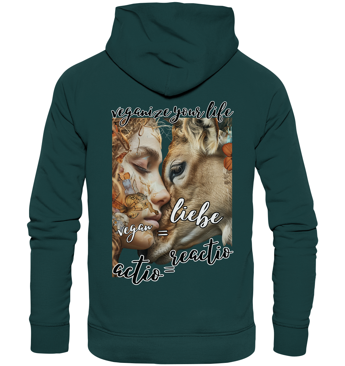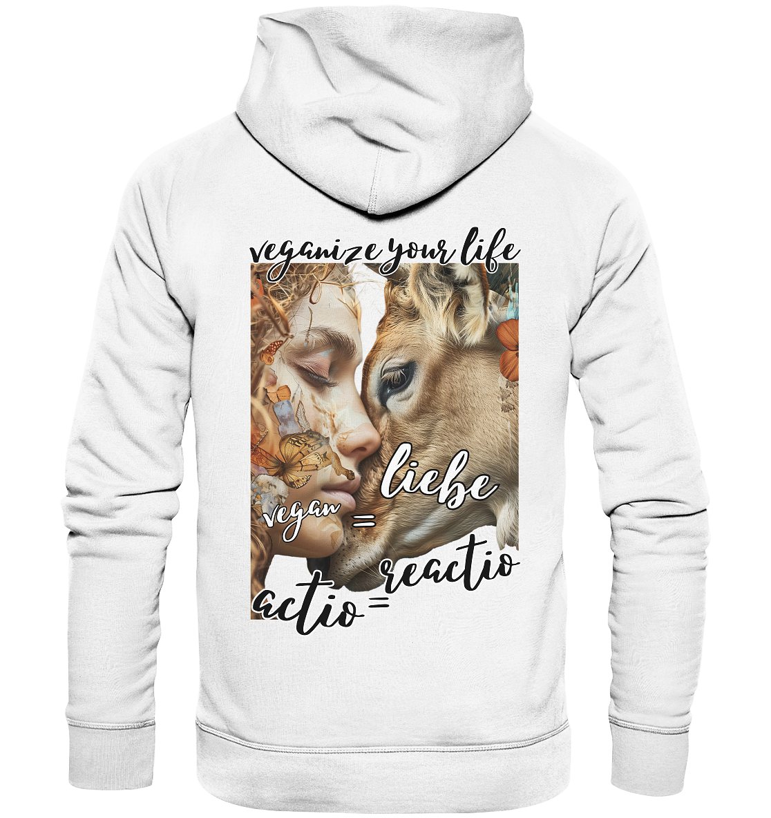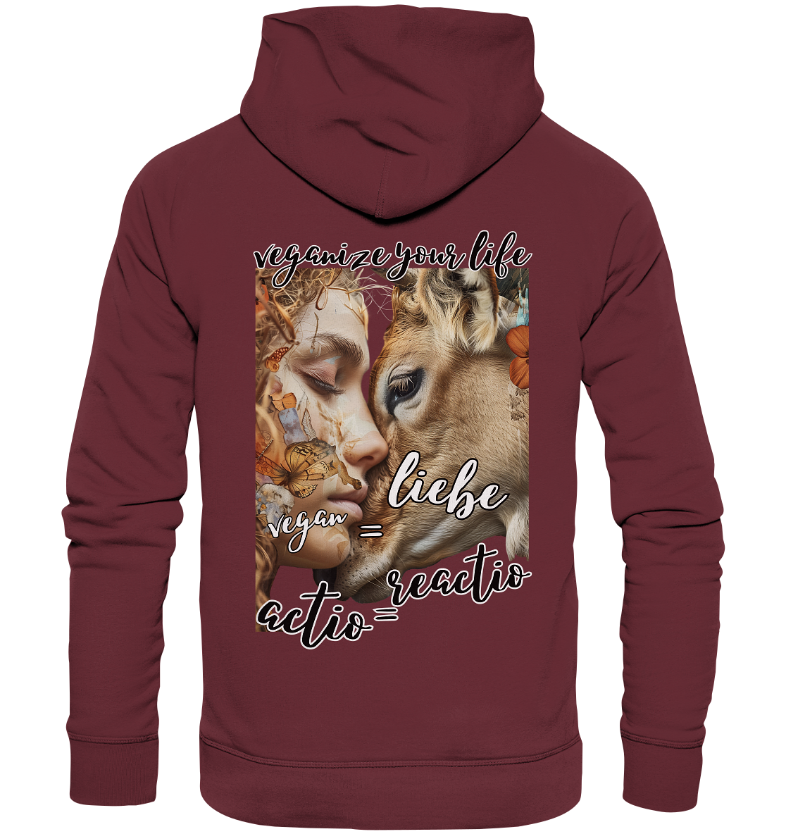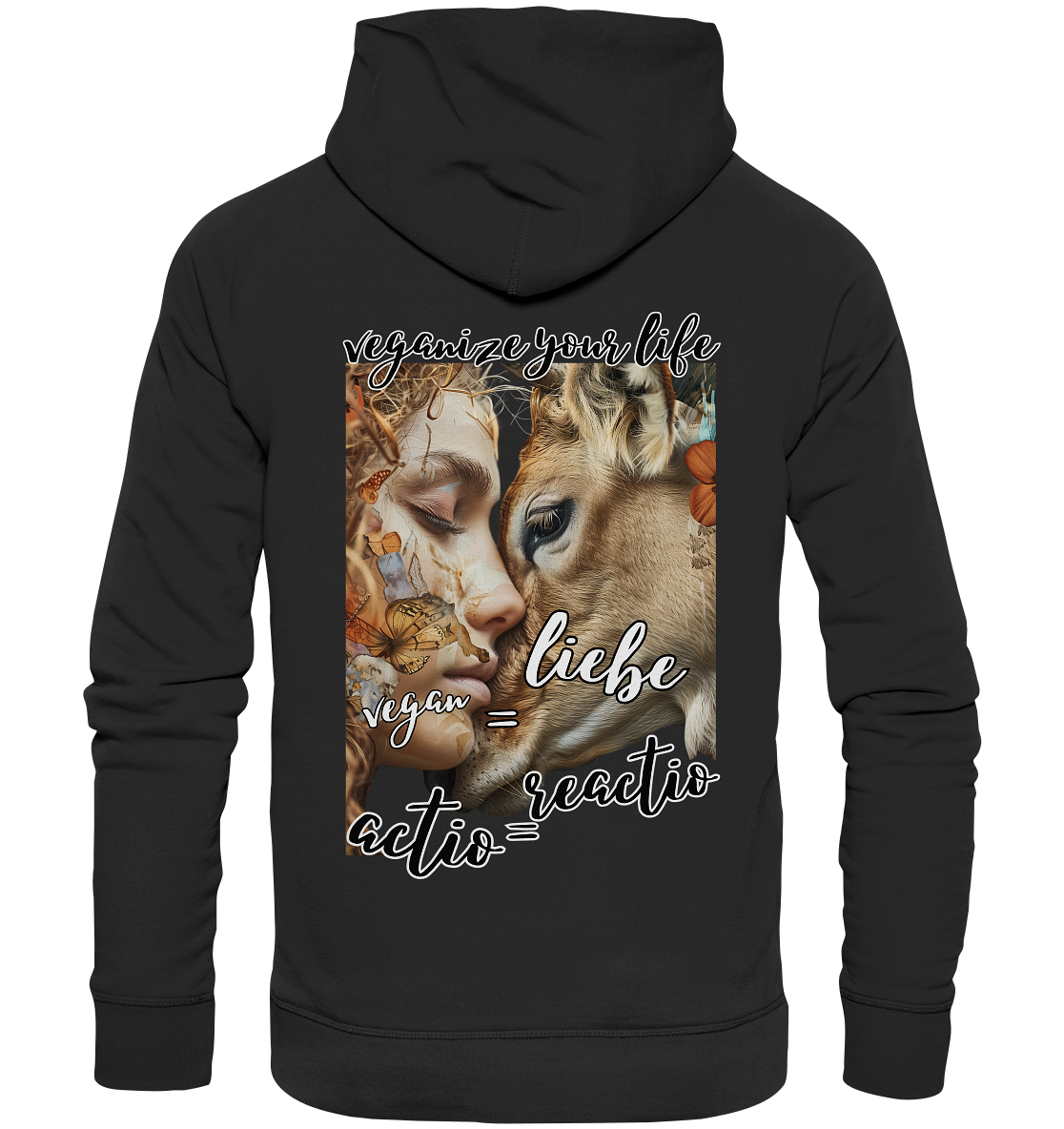 "Action = Reaction, Vegan = Love" – this cool, unisex hoodie not only carries a message, but an entire attitude to life. The print depicts a human head and an animal head leaning against each other – a symbol of compassion, equality, and respect. Because what we give to the world comes back to us. Choose love, choose mindfulness, choose veganism.