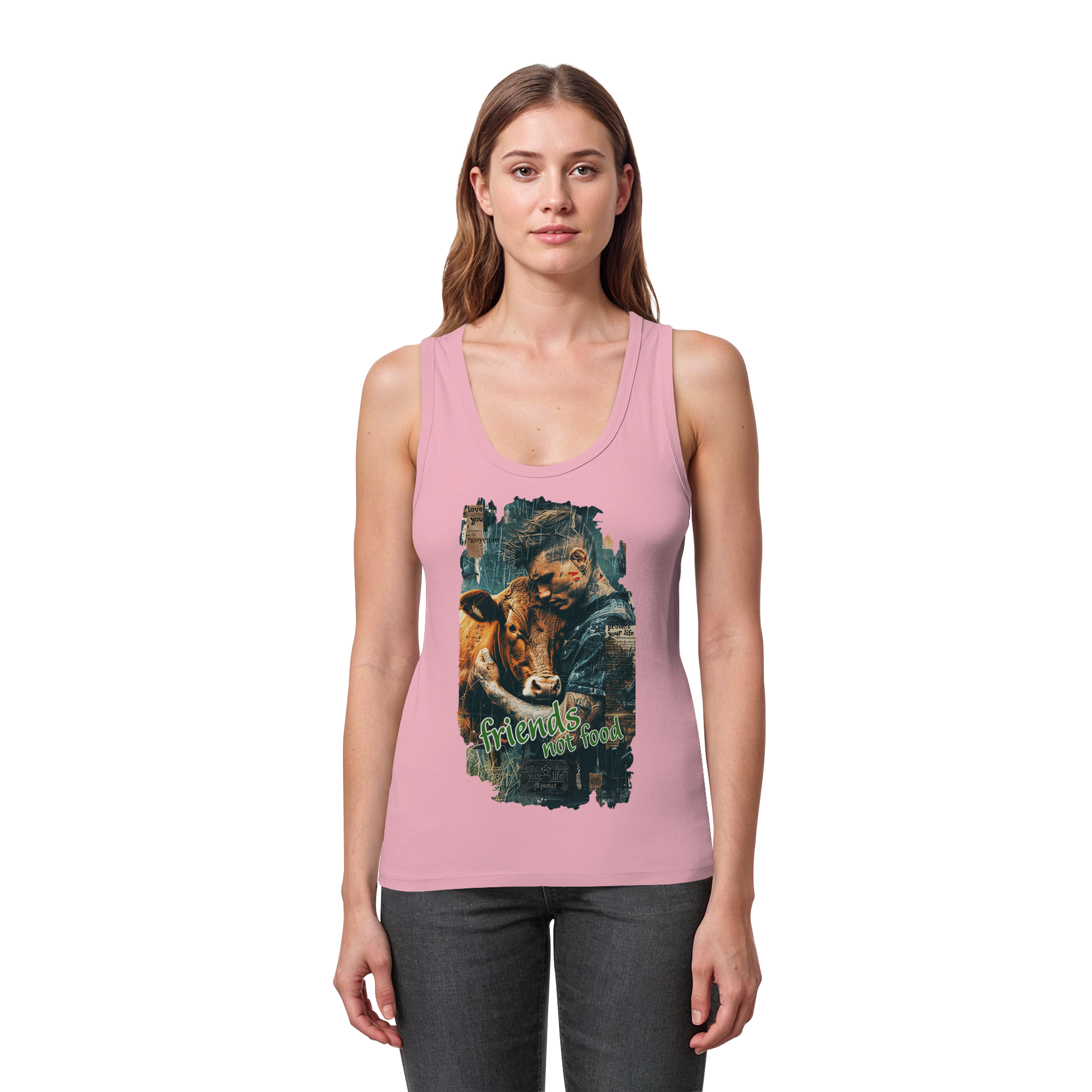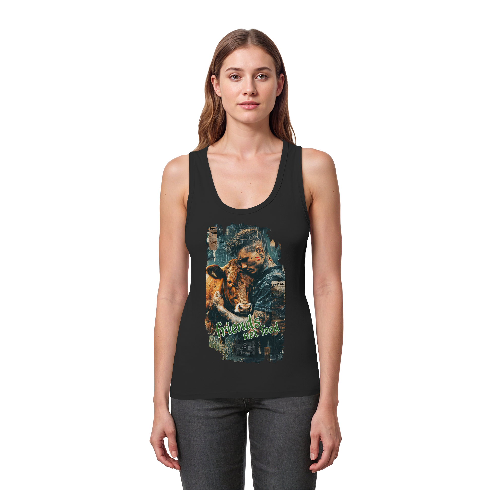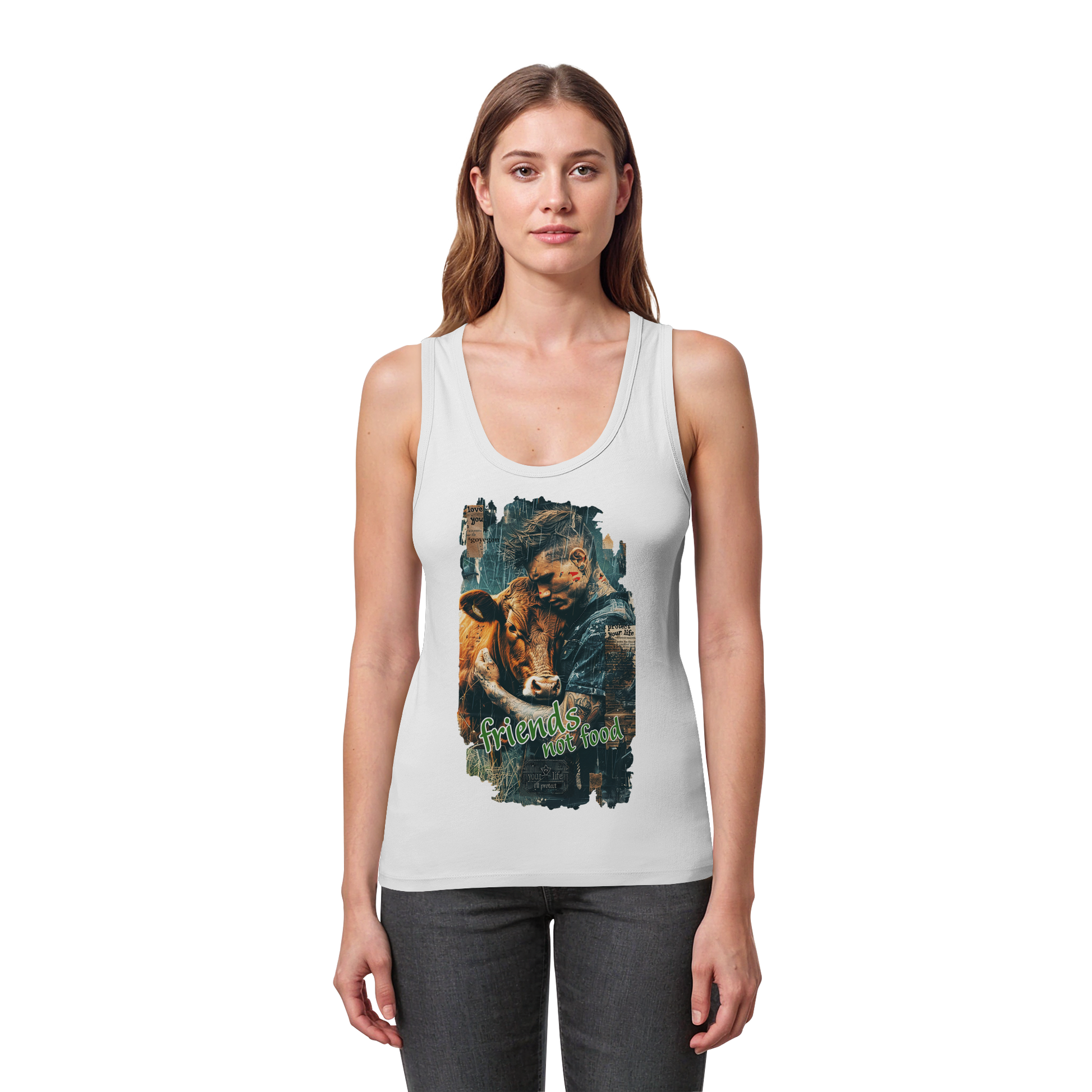 Das freche Damen Bio Tank Top zeigt einen coolen, tätowierten Typen, der eine Kuh herzlich in den Arm nimmt – beide wirken total entspannt und zufrieden. Die Message „Friends, not Food“ sagt klar aus, dass Tiere nicht auf den Teller, sondern ins Herz gehören. Das Design verbindet eine lockere, moderne Optik mit einer starken, veganen Botschaft – perfekt, um ein Statement für Tierliebe und Mitgefühl zu setzen!