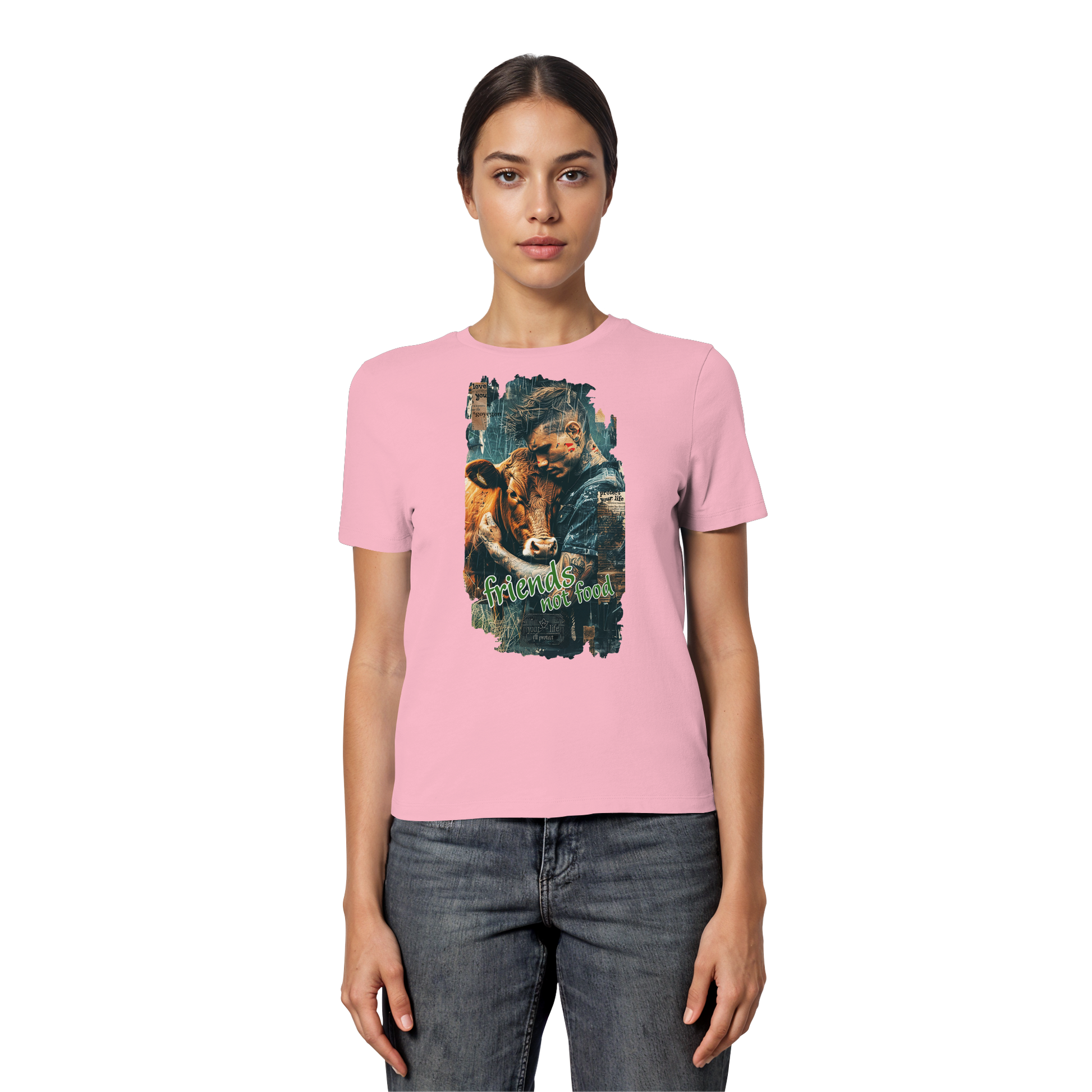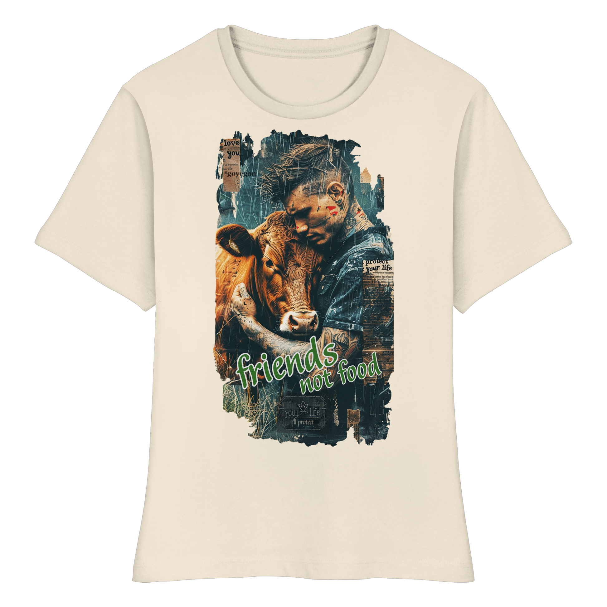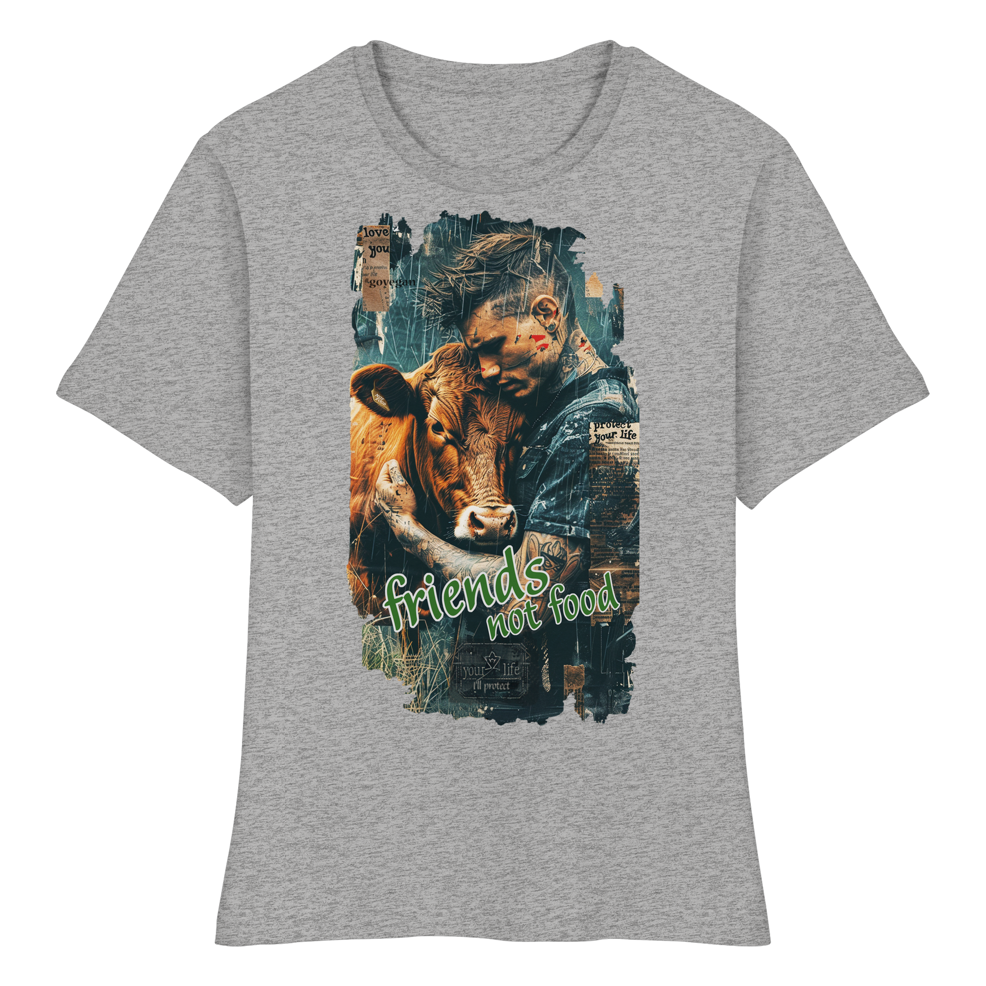 Das eng geschnittene Damen Bio T-Shirt zeigt einen coolen, tätowierten Typen, der eine Kuh herzlich in den Arm nimmt – beide wirken total entspannt und zufrieden. Die Message „Friends, not Food“ sagt klar aus, dass Tiere nicht auf den Teller, sondern ins Herz gehören. Das Design verbindet eine lockere, moderne Optik mit einer starken, veganen Botschaft – perfekt, um ein Statement für Tierliebe und Mitgefühl zu setzen!