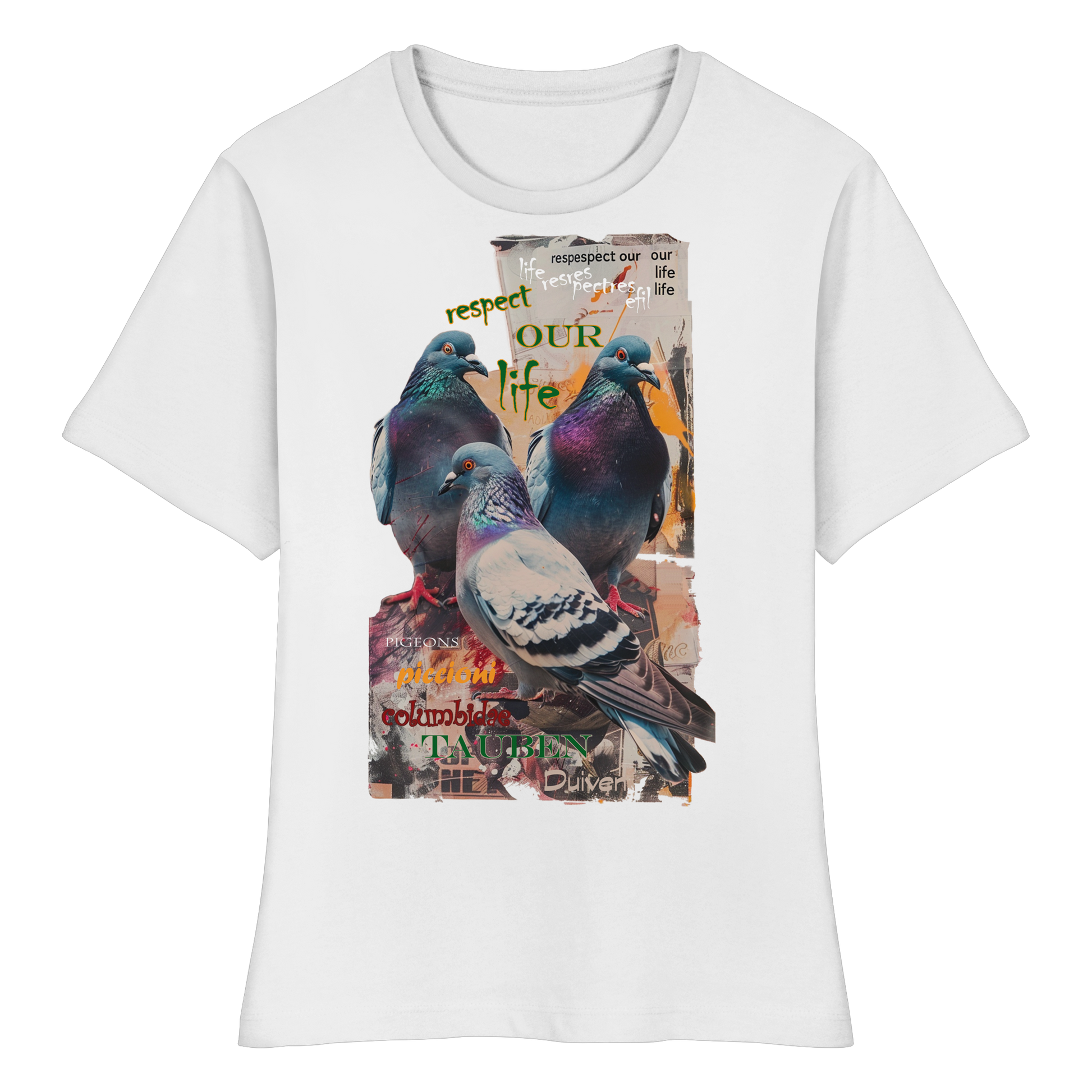 Eine Gruppe Tauben vor dem Hintergrund einer unordentlich beklebten, verwahrlosten Plakatwand und einer wichtigen Botschaft: "respect our life". Dieses Motiv symbolisiert die geringe Achtsamkeit und den mangelnden Respekt vor allem Leben, inklusive unserer gefiederten Freunde, den Stadttauben.
