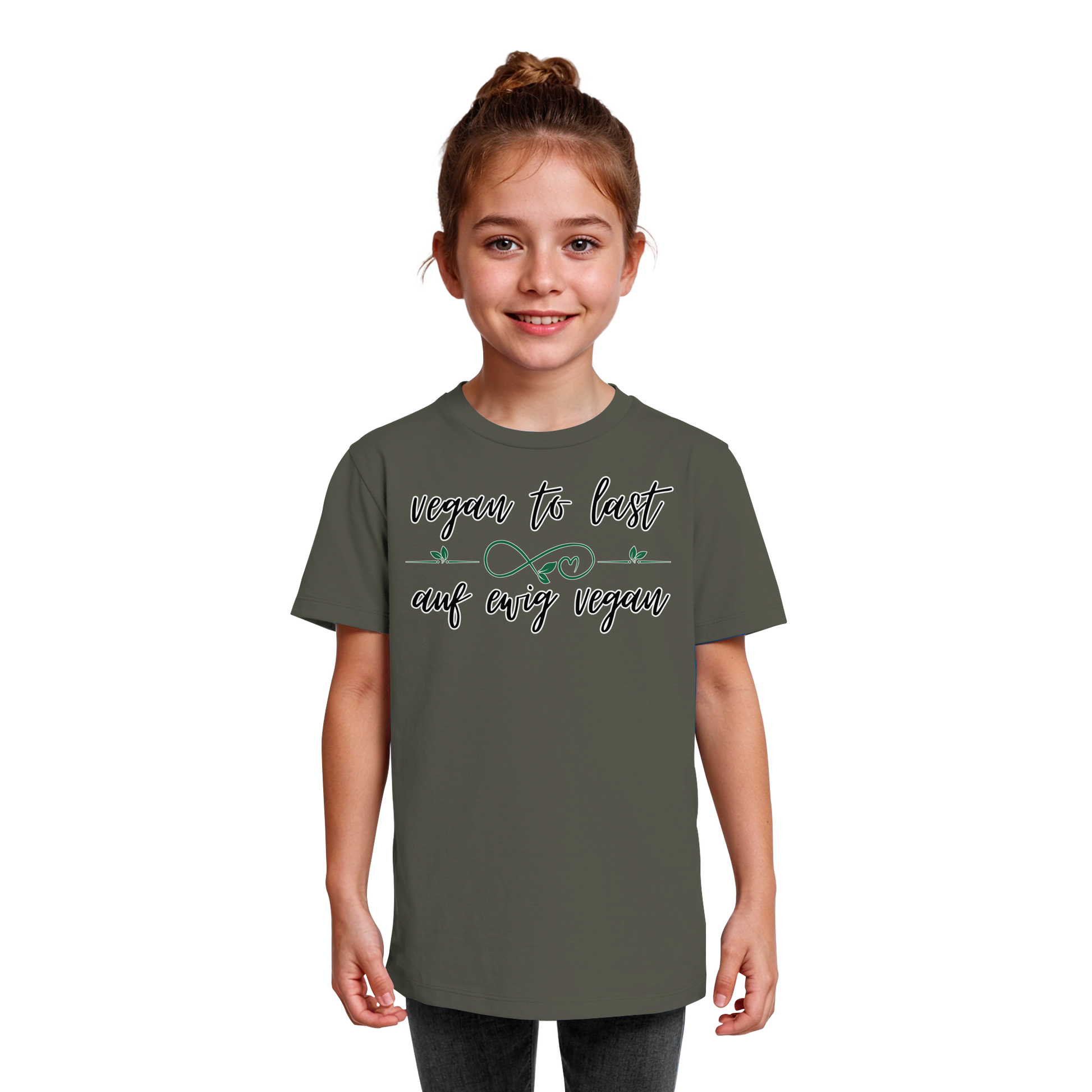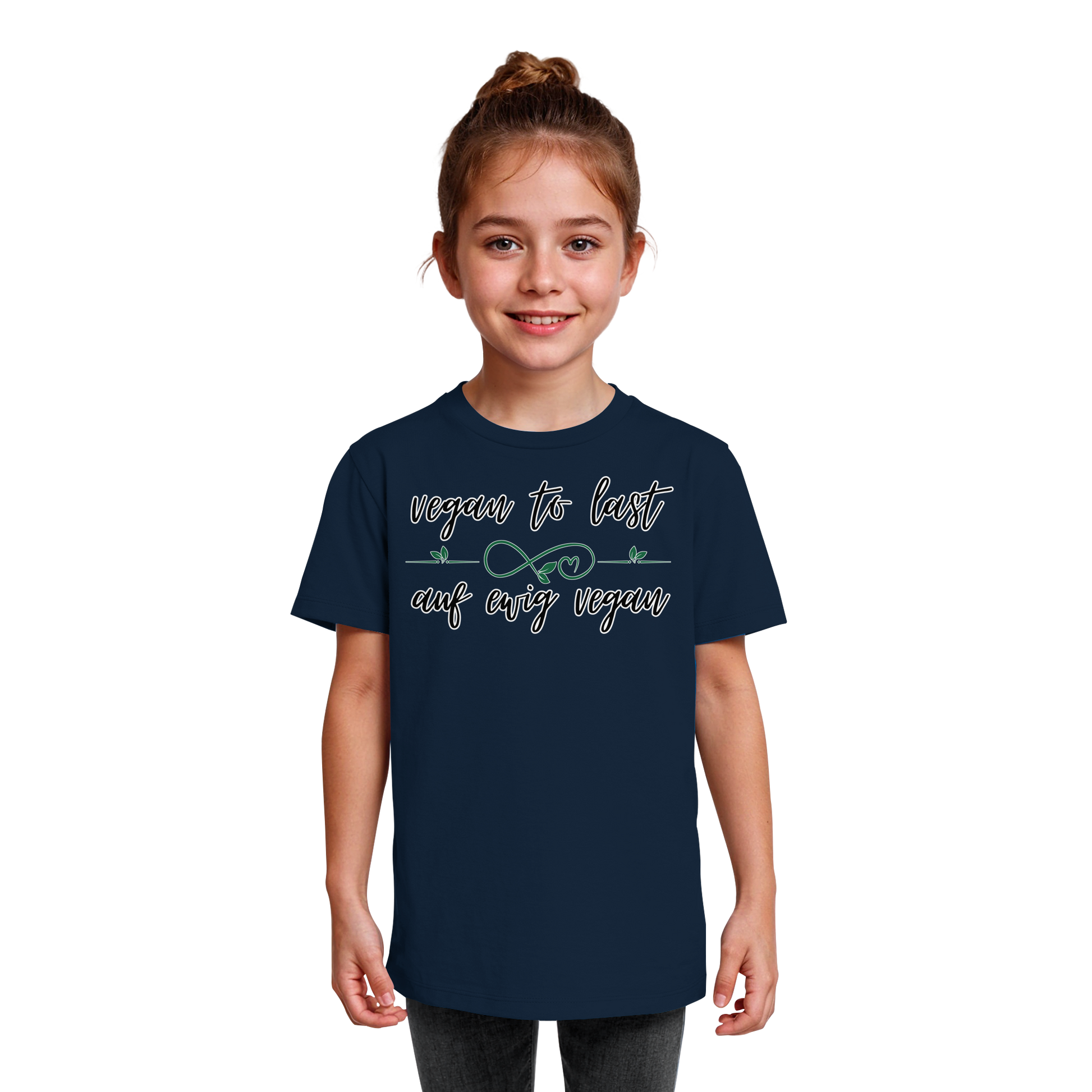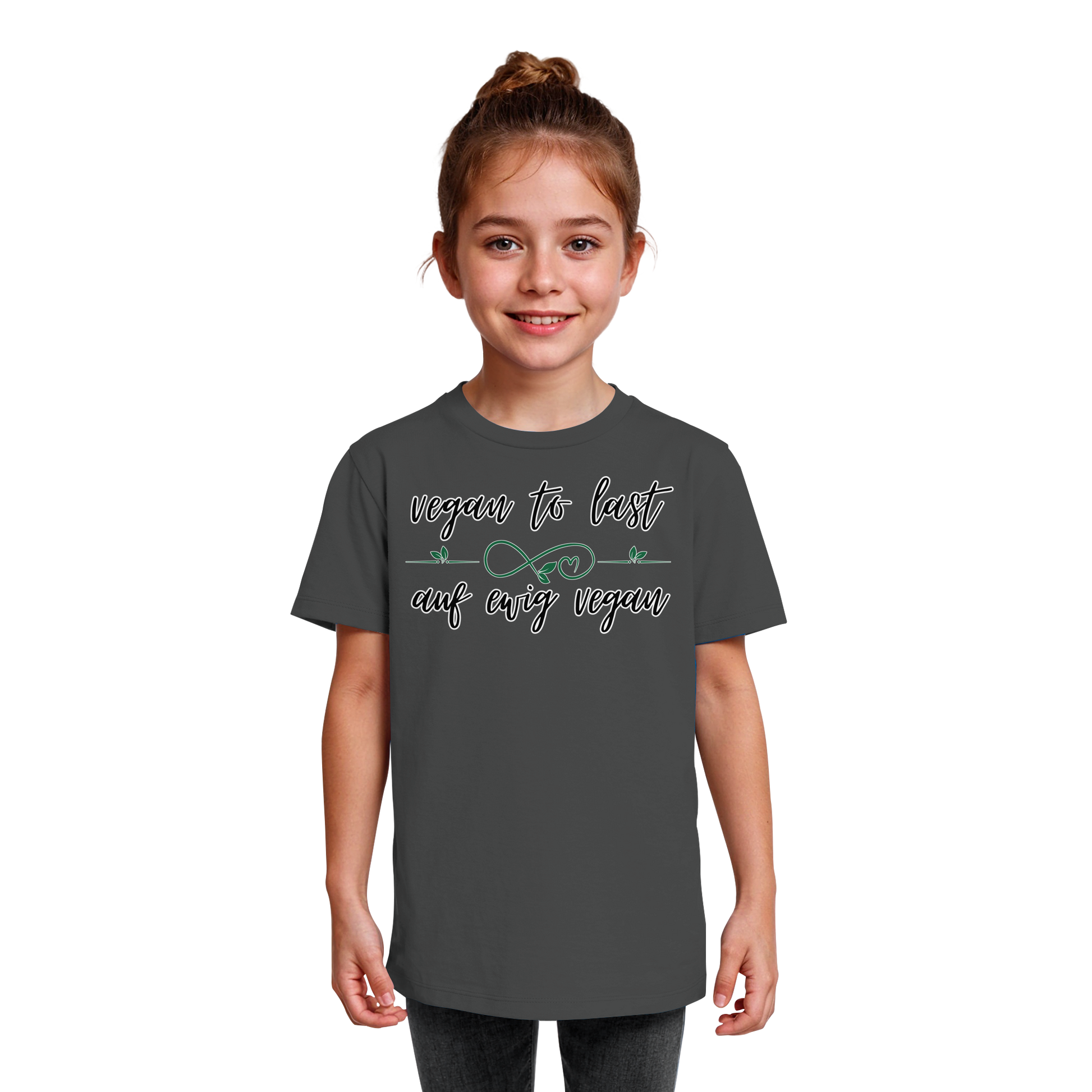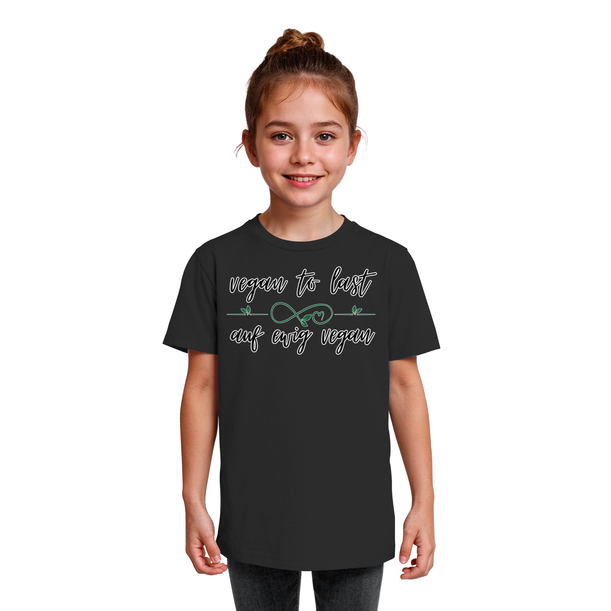 Dieses vegane unisex Kinder T-Shirt aus Bio Baumwolle trägt den inspirierenden Slogan "vegan to last - auf ewig vegan" – ein schlichtes und doch kraftvolles Statement für einen nachhaltigen, veganen Lebensstil. Vegan ist die Zukunft, die Zukunft ist vegan.