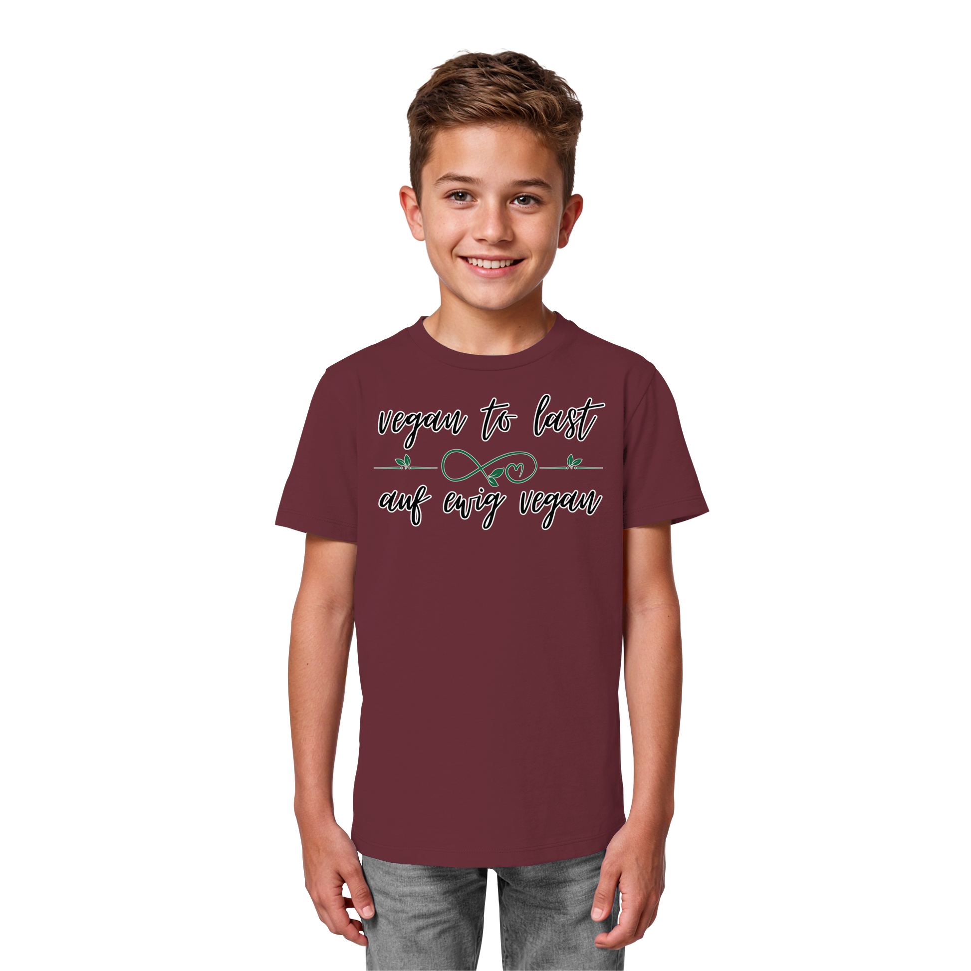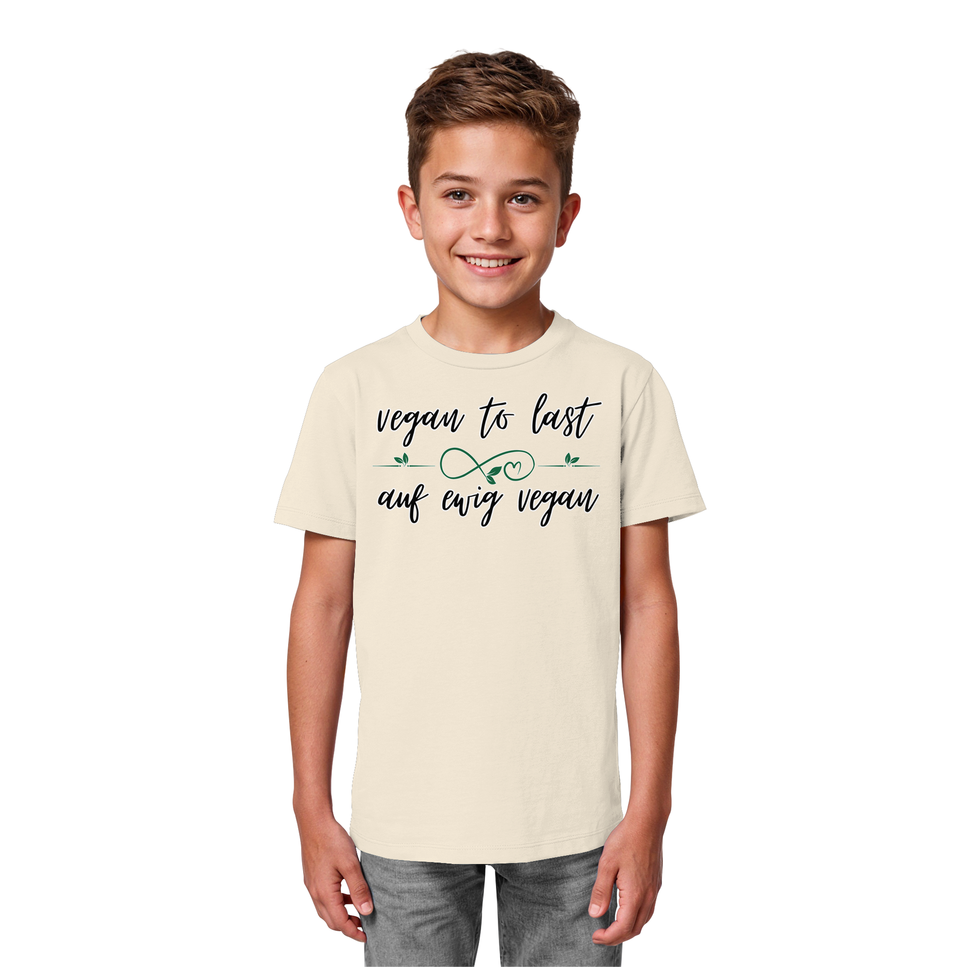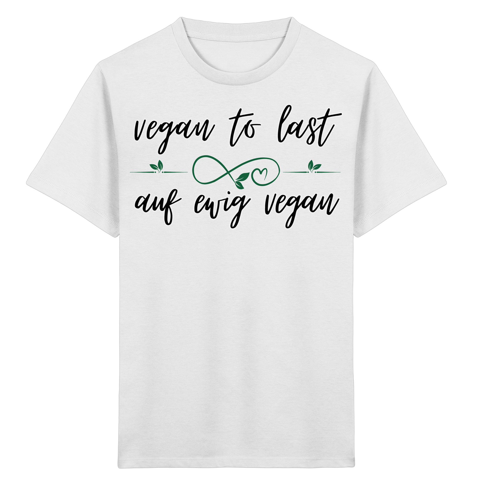 Dieses vegane unisex Kinder T-Shirt aus Bio Baumwolle trägt den inspirierenden Slogan "vegan to last - auf ewig vegan" – ein schlichtes und doch kraftvolles Statement für einen nachhaltigen, veganen Lebensstil. Vegan ist die Zukunft, die Zukunft ist vegan.