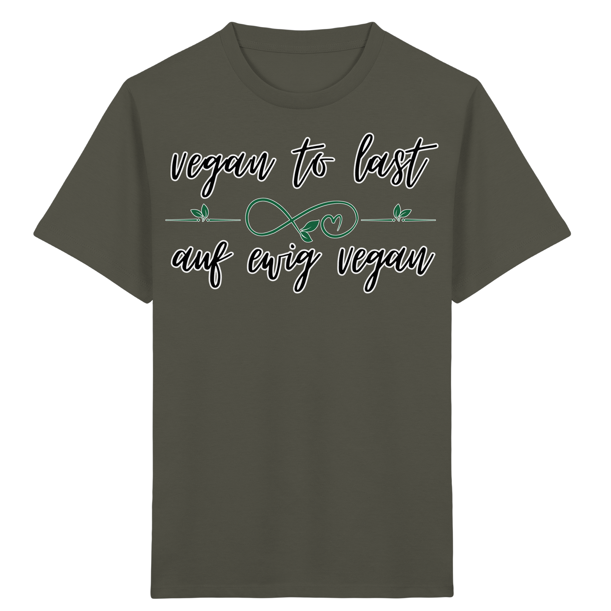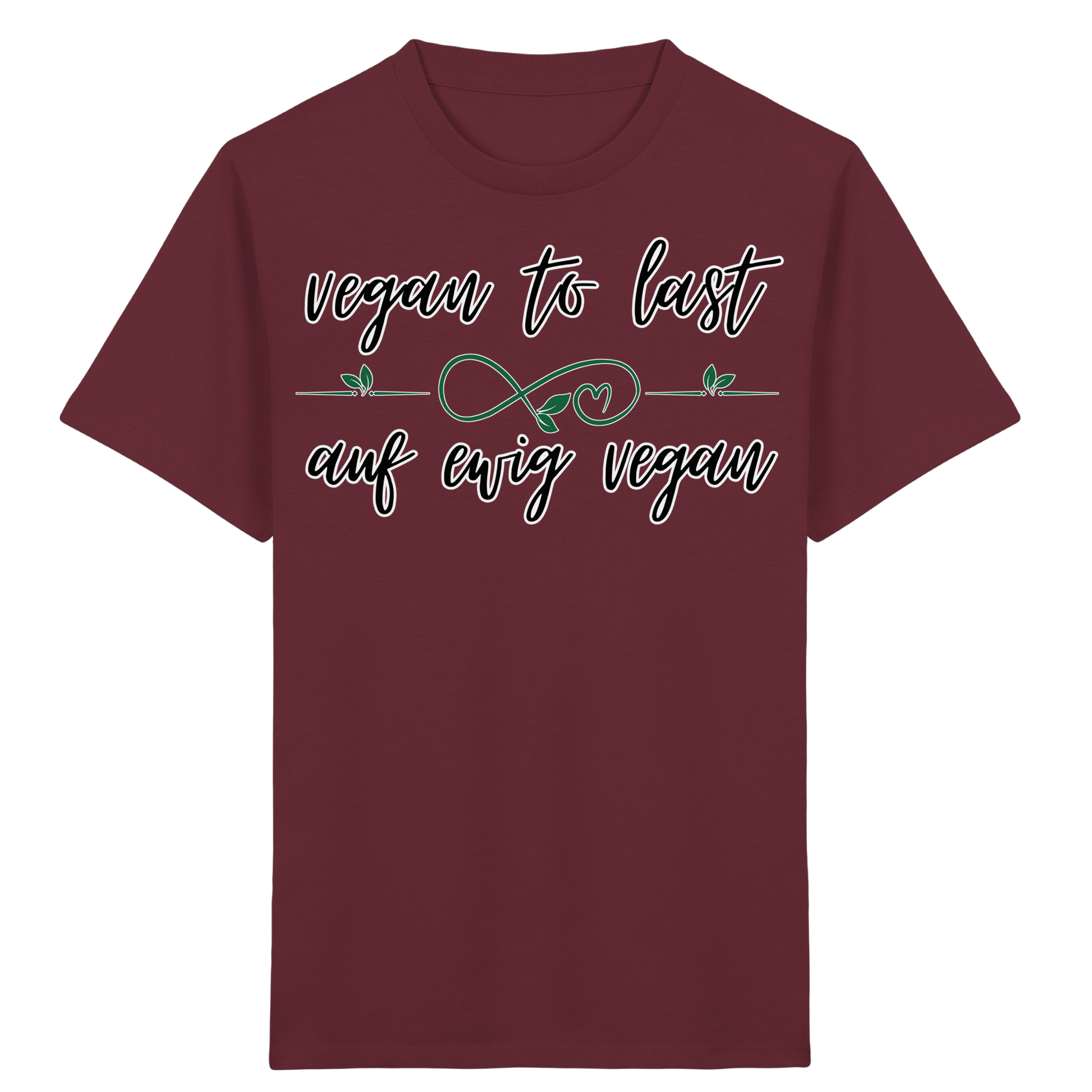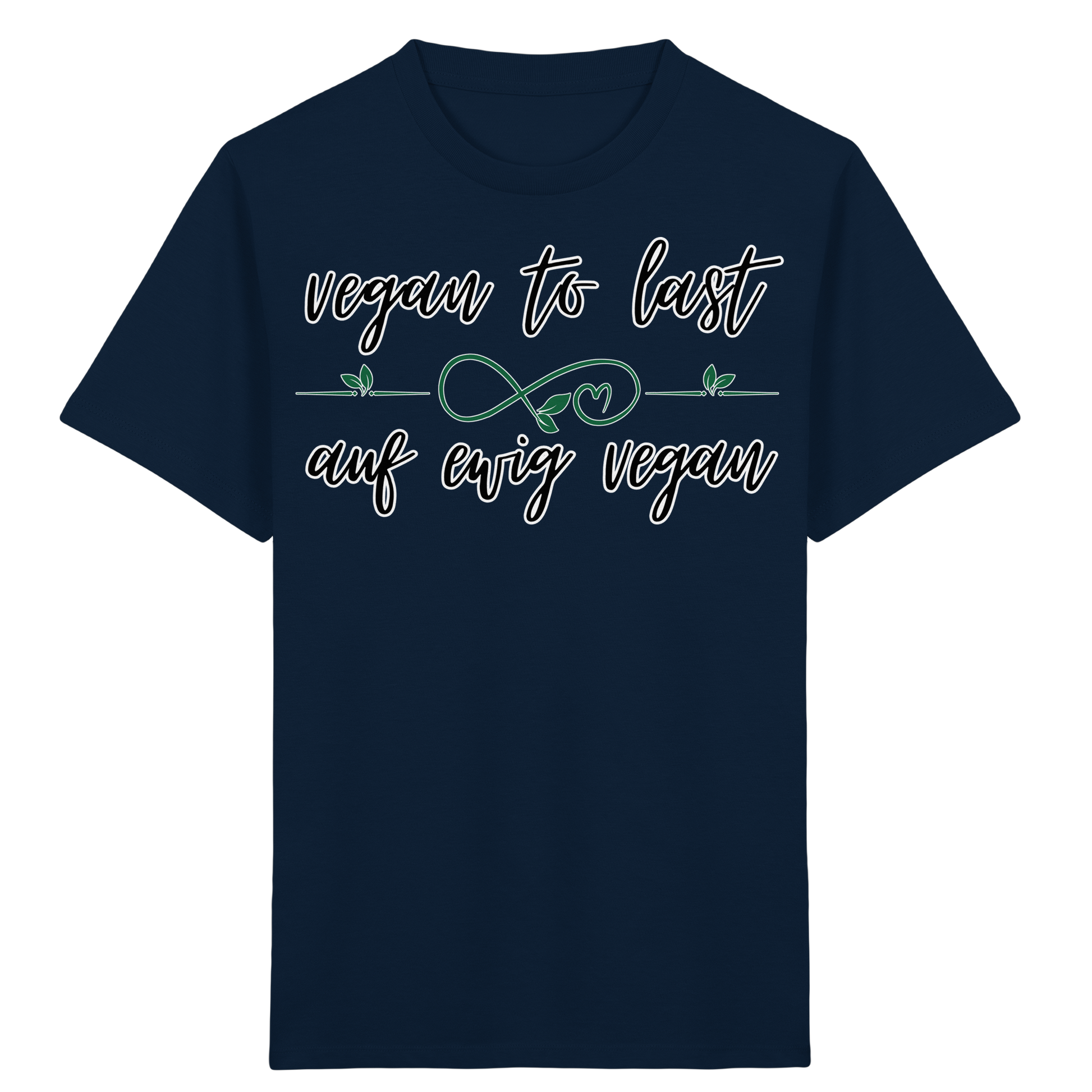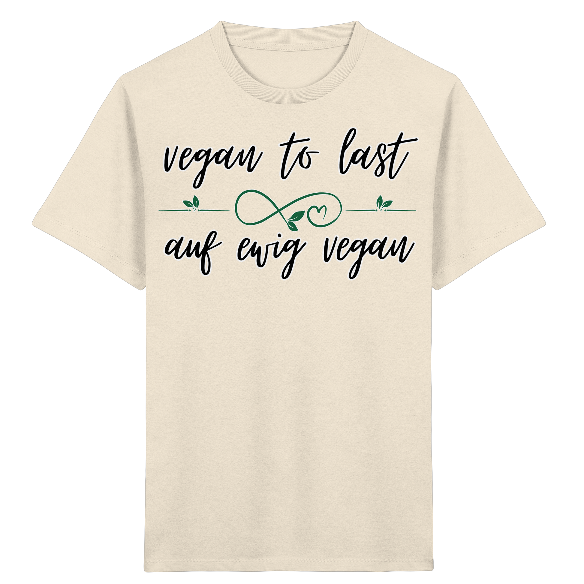 Dieses vegane unisex Kinder T-Shirt aus Bio Baumwolle trägt den inspirierenden Slogan "vegan to last - auf ewig vegan" – ein schlichtes und doch kraftvolles Statement für einen nachhaltigen, veganen Lebensstil. Vegan ist die Zukunft, die Zukunft ist vegan.