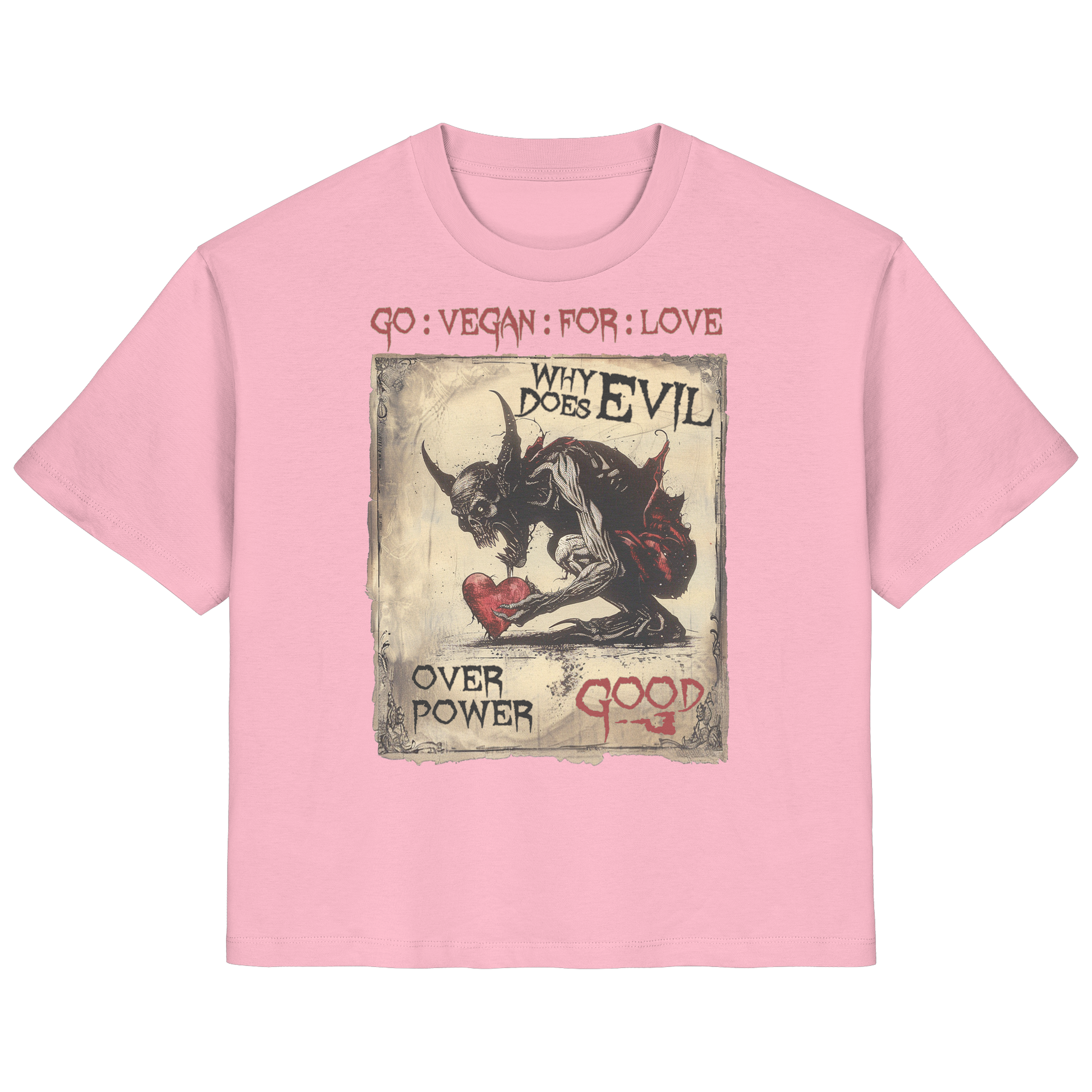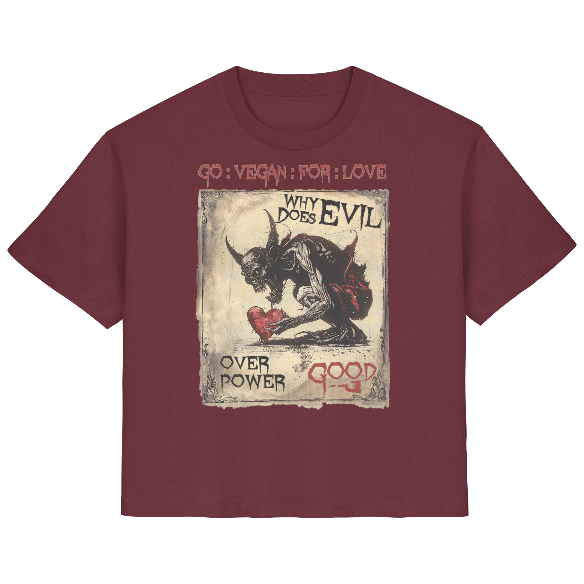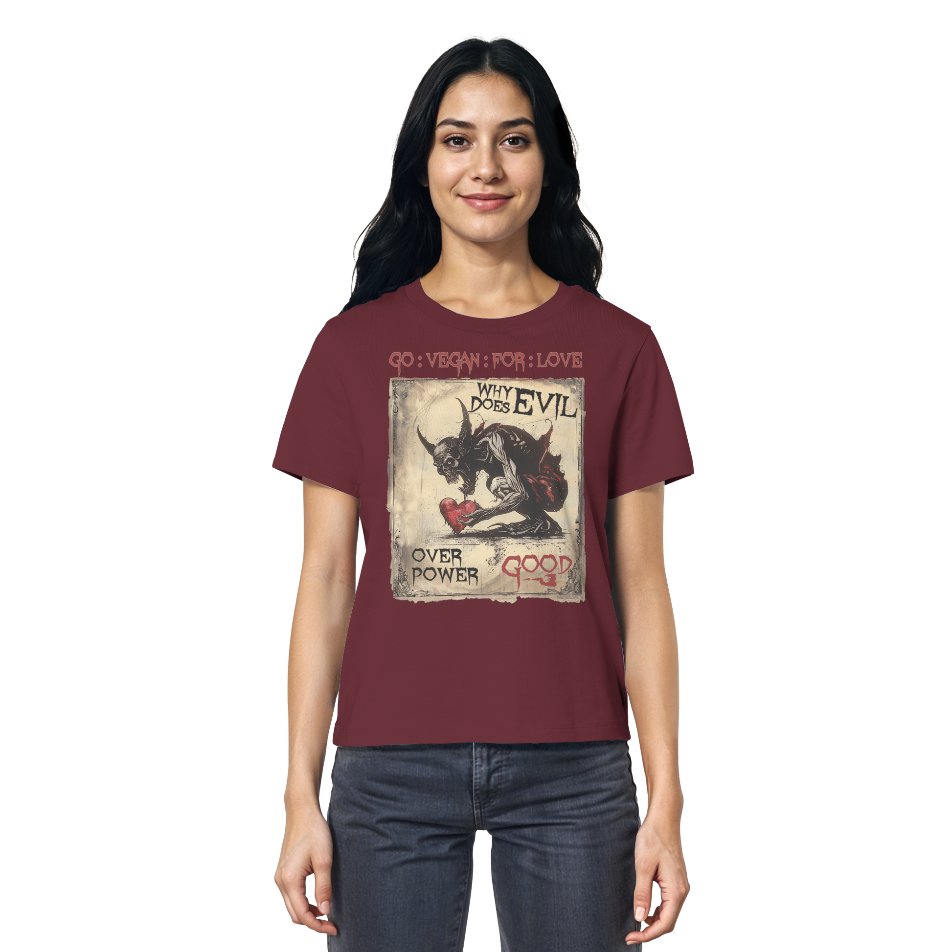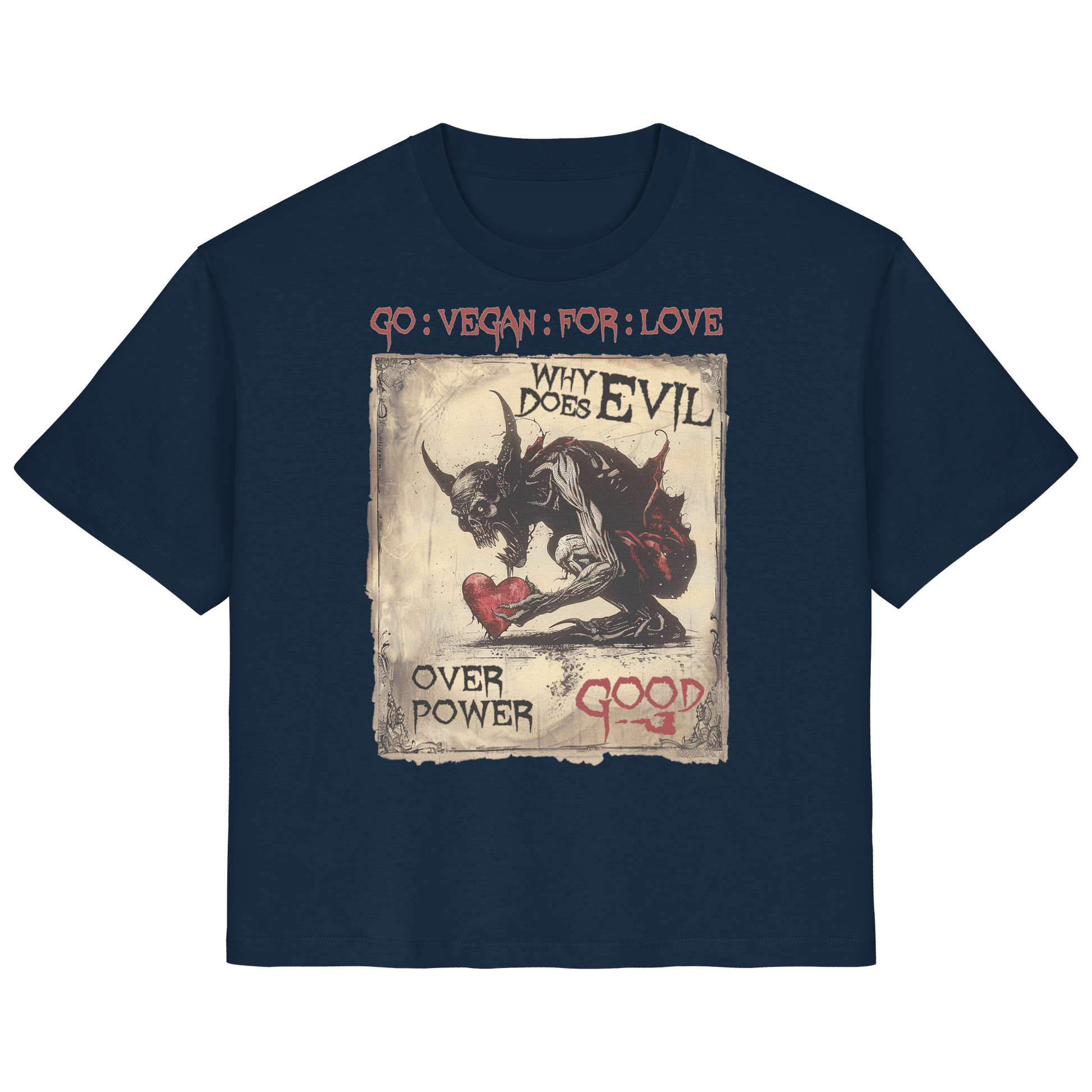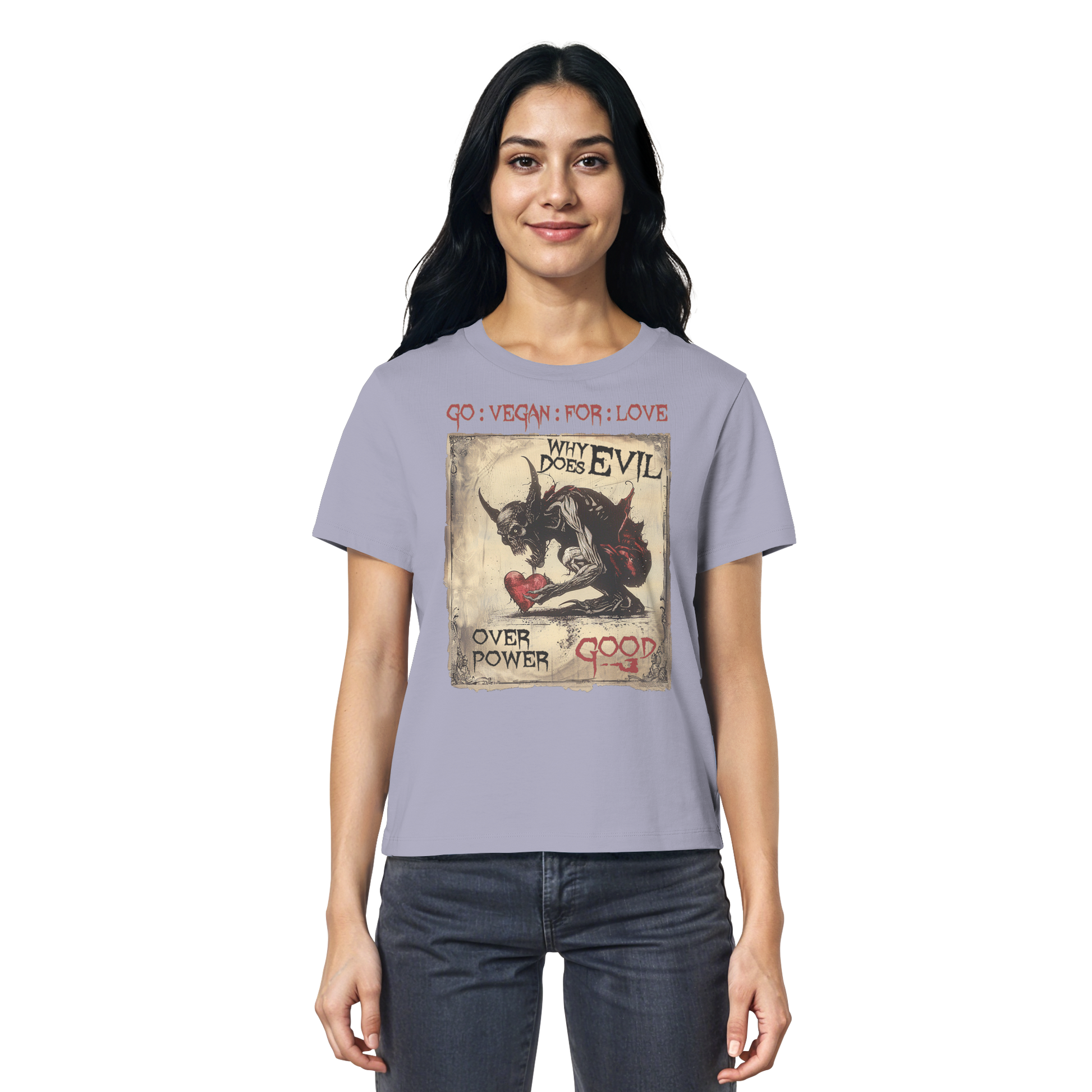 Das Damen Bio T-Shirt ist nicht nur ein stylisches Kleidungsstück, sondern auch eine starke Botschaft im Rahmen des Veganismus. Es stellt die ethische Frage in den Vordergrund, warum das Schlechte – wie Tierleid und Umweltzerstörung – zu oft über das Gute siegt, und fordert dazu auf, Verantwortung zu übernehmen. Das Design veranschaulicht den Kampf zwischen Bewusstsein und Ignoranz, indem es die Auswirkungen der Ausbeutung von Tieren und der Umwelt aufgreift.